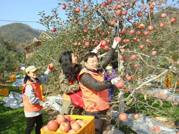 청주시시설관리공단(이사장 한권동) 임직원들인 지난 4일 1사1촌 결연 마을인 미원면 운암리 사과 재배 농가를 찾아 봉사활동을 전개했습니다.