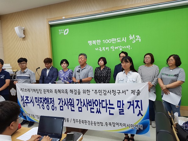 충북지역 시민사회단체들과 청주시가 폐기물 처리업체 ‘ES청원 특혜의혹’ 등 청주 제2 쓰레기매립장 조성 과정에서 불거진 각종 의혹에 대한 감사원 감사를 받았는지 여부에 대한 진실 공방이 벌어지고 있습니다.