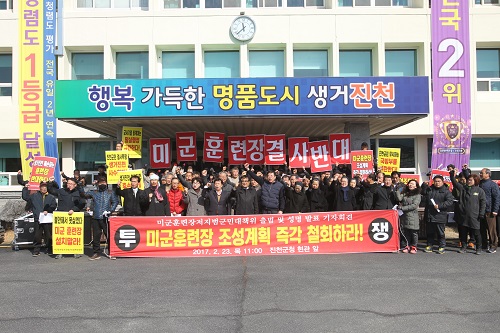 대책위는 오늘(23일) 오전 100여명의 주민들이 참여한 가운데 진천군청 앞 광장에서 출범식과 함께 기자회견을 열고 “미군 훈련장을 조성하는 것은 진천에 청천벽력 같은 소식”이라며 “(국방부가) 폐쇄적 행정과 밀실 행정으로 진천군 주민들을 철저하게 무시하고 있다”고 주장했습니다.